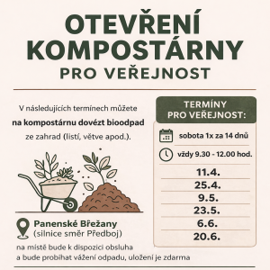 Počínaje dubnem 2026 nabízíme ve spolupráci s panem Ondřejem Bačinou možnost vlastního odvozu bioodpadu na kompostárnu v naší obci. V uvedených termínech můžete na kompostárnu dojet vlastním autem a odložit zde bioodpad z Vašich zahrad. Uložení bioodpadu je zdarma, podmínkou je pouze jeho zvážení.