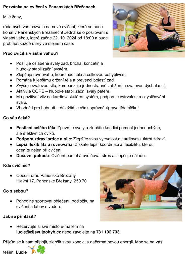 Od úterý 22. října bude na obecním úřadě probíhat nové posilovací cvičení pro ženy pod vedením zkušené trenérky Lucie Lovíškové. Více informací i možnosti přihlášení najdete v přiloženém letáku.