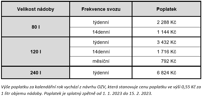Vyhláška obce určuje sazbu poplatku ve výši 0,55 Kč za 1 litr měsíčně. Zároveň stanovuje minimální základ ve výši 30 l na obyvatele v dané nemovitosti za měsíc.